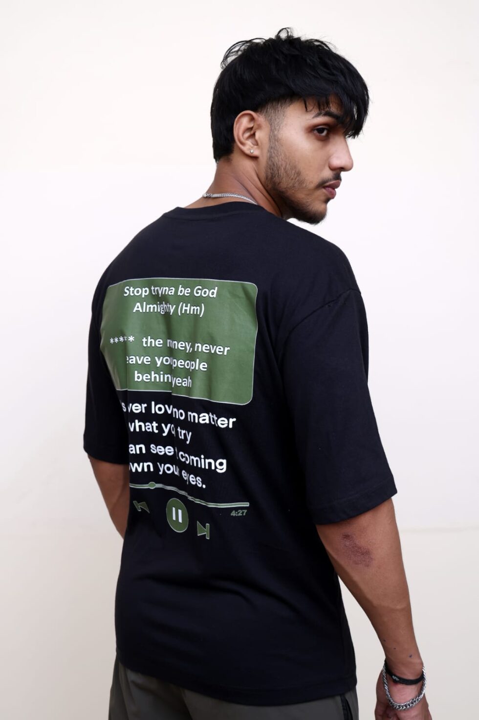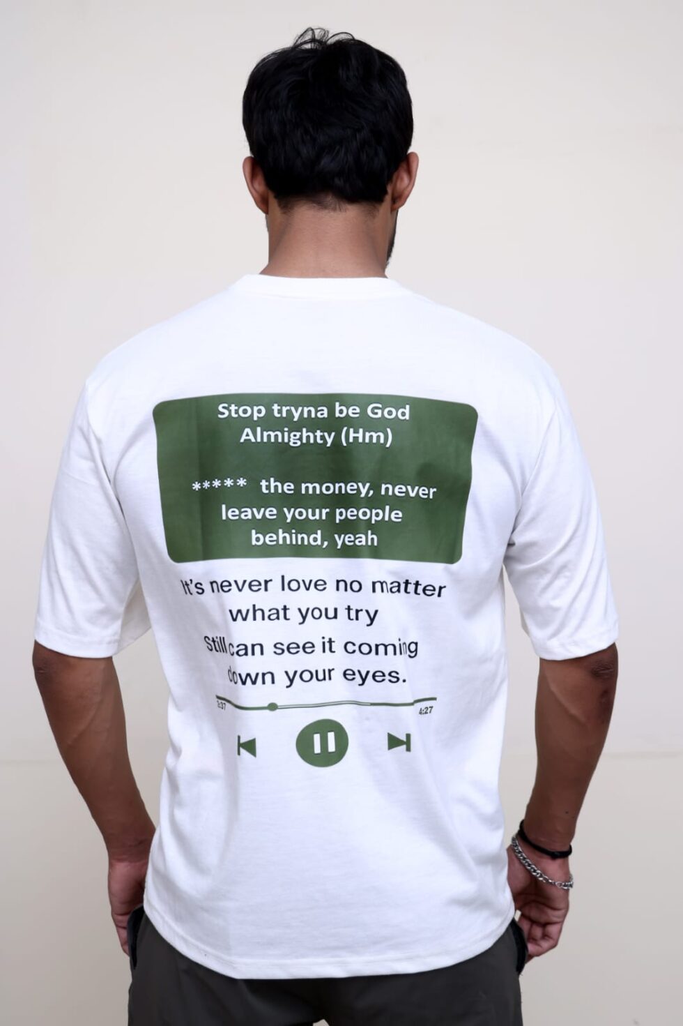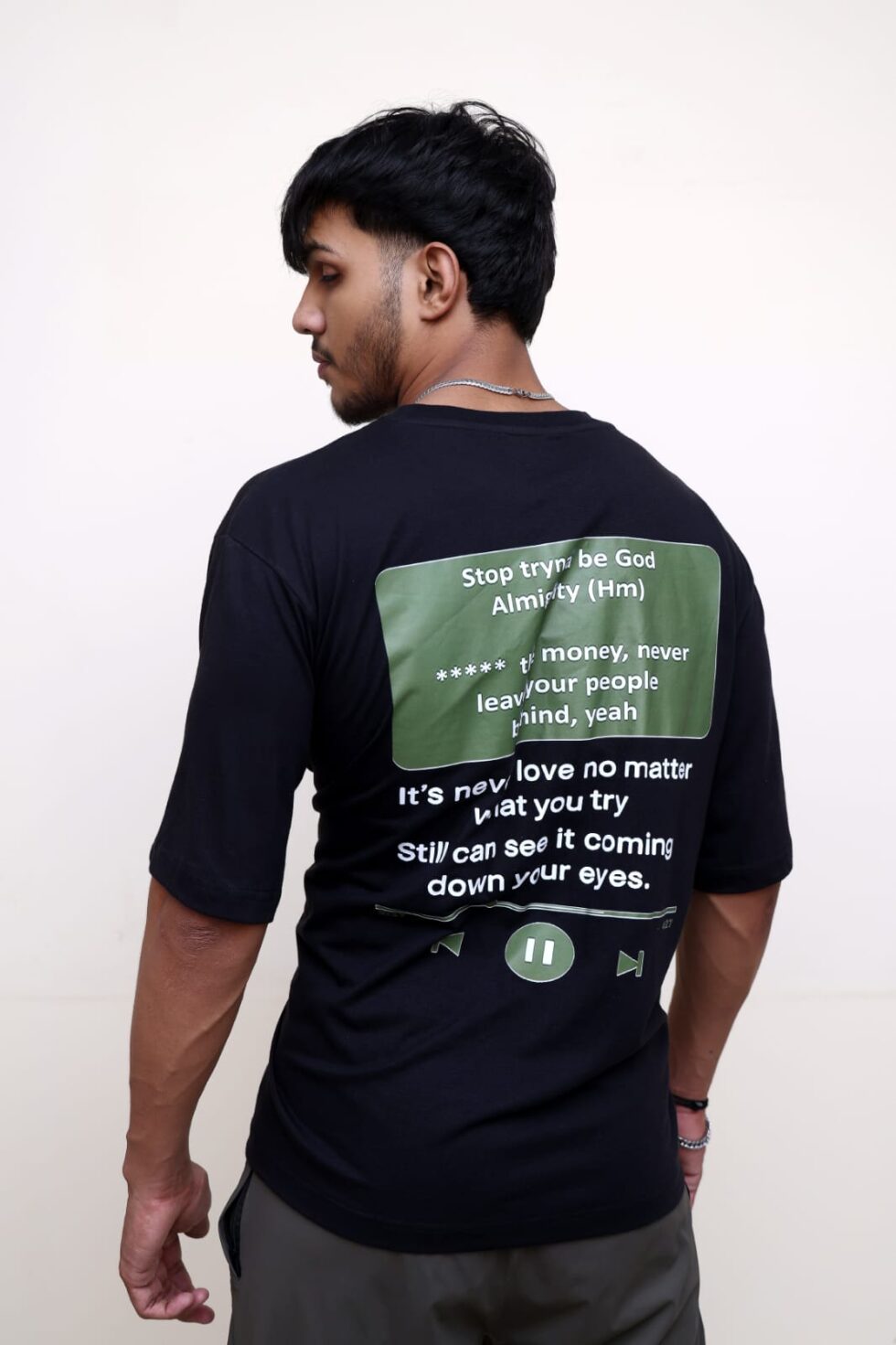 Turn the shirt around and you step into the moment every real listener knows: a music player glowing in the dark, lyrics cutting deeper than conversations ever could.